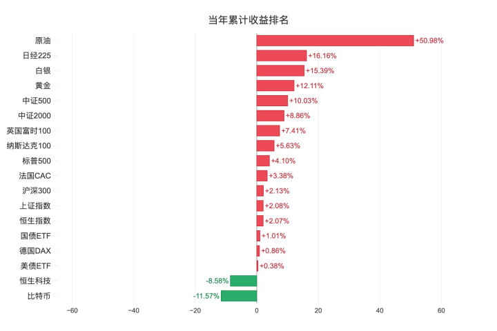 商品这边反差最大。原油因为中间那段供给因素涨了 50% 以上,黄金白银都涨了不少,但比特币年内反而跌了 11.5%。
