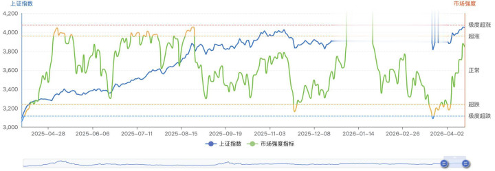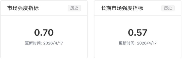 短期强度指标现在是 0.70,长期强度 0.57,两个都处在正常偏高的位置。3 月下旬的时候,当时市场有一波比较明显的回调,那次市场强度指标到了极度超跌的位置,后续市场确实也反弹了一个不错的幅度呀。