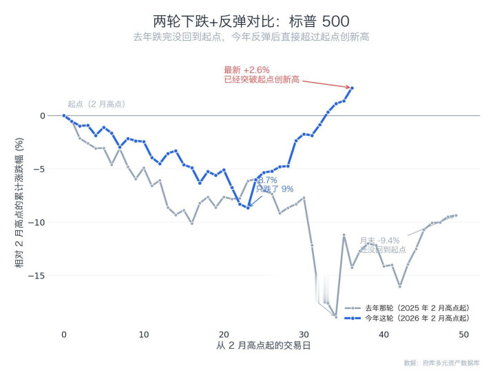 今年这轮,标普 500 从 2 月 25 日的高点跌到 3 月 30 日的低点,只跌了 9% 就止住了,下跌深度比去年浅了一半。然后从低点开始几乎一路向上,13 个交易日之后,标普 500 直接突破 2 月的高点,创出了历史新高。