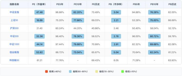 再看各个宽基指数。沪深 300 的估值还算合理。但中证 500、中证 1000、创业板这些中小盘和成长股的 PE 5 年分位基本都在 88% 以上,虽然放在十年和历史的周期上面还没有达到这么夸张,但确实不便宜了。
